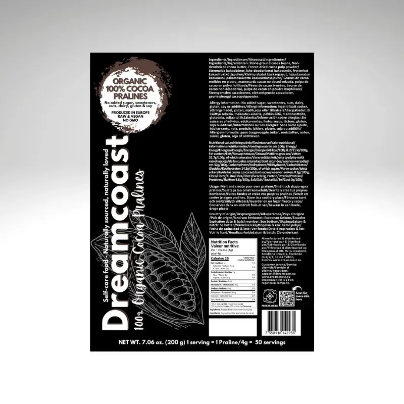 Experience the pure and clean taste of our Organic Cocoa Pralines, presented in a 200-gram package. Made from the finest organic cocoa beans. these pralines offer a luxurious chocolate experience without any added sweeteners.